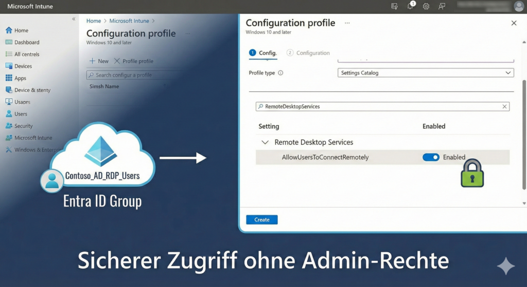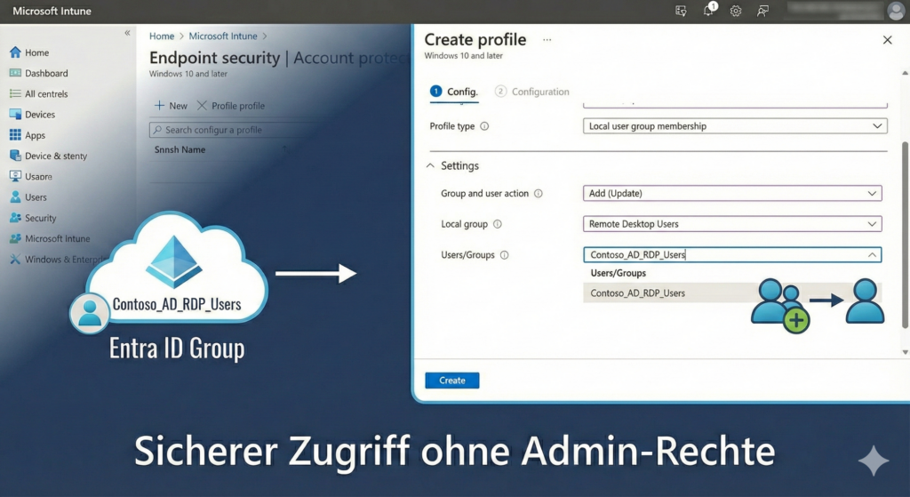 * **Description:** Fügt eine synchronisierte Entra ID-Sicherheitsgruppe der lokalen Gruppe „Remote Desktop Users“ auf den Endgeräten der Contoso Corporation hinzu.