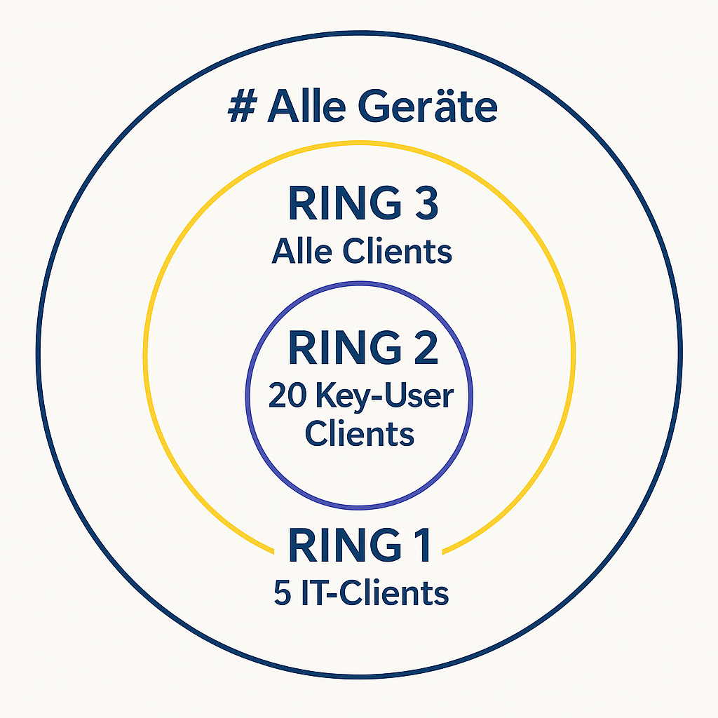Im Rahmen unserer modernen Endpoint-Verwaltung setzen wir auf Microsoft Intune, um Software gezielt, kontrolliert und abgestuft auf die Geräteflotte auszurollen. Damit Updates und neue Anwendungen zuverlässig funktionieren, bevor sie unternehmensweit verteilt werden, haben wir ein ringbasiertes Rollout-Modell eingeführt.